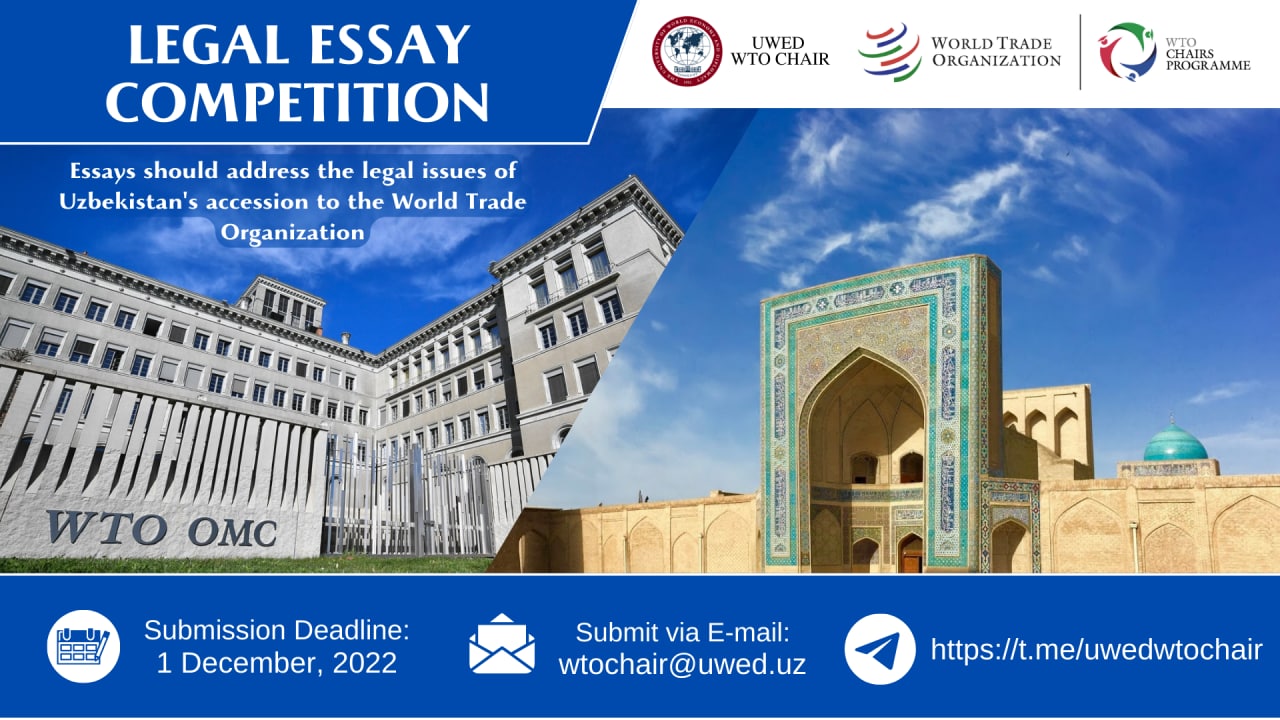 Конкурс юридических эссе между студентами бакалавриата, магистратуры и докторантуры на темы, посвященные правовым вопросам вступления Узбекистана во Всемирную торговую организацию.